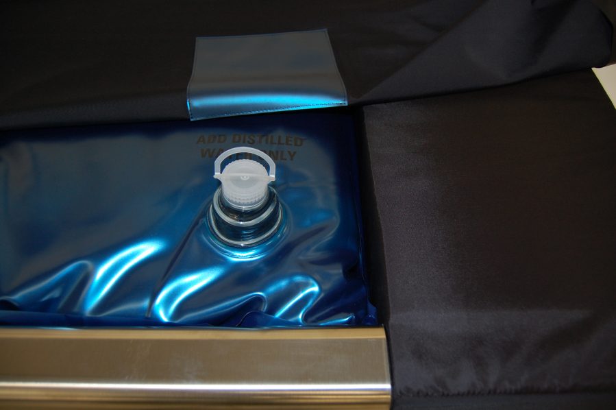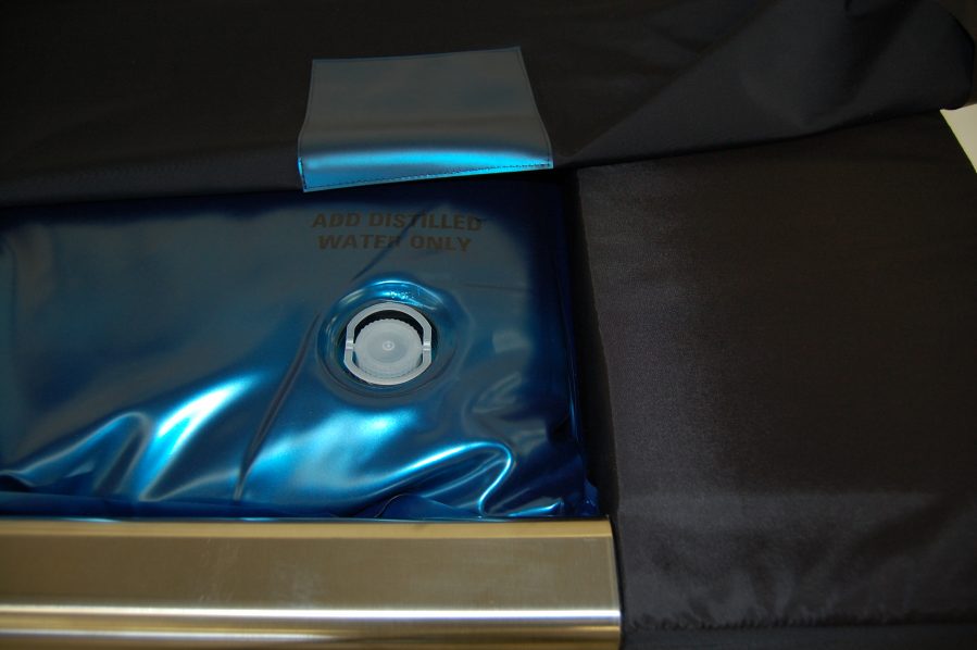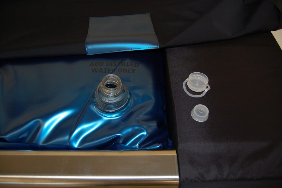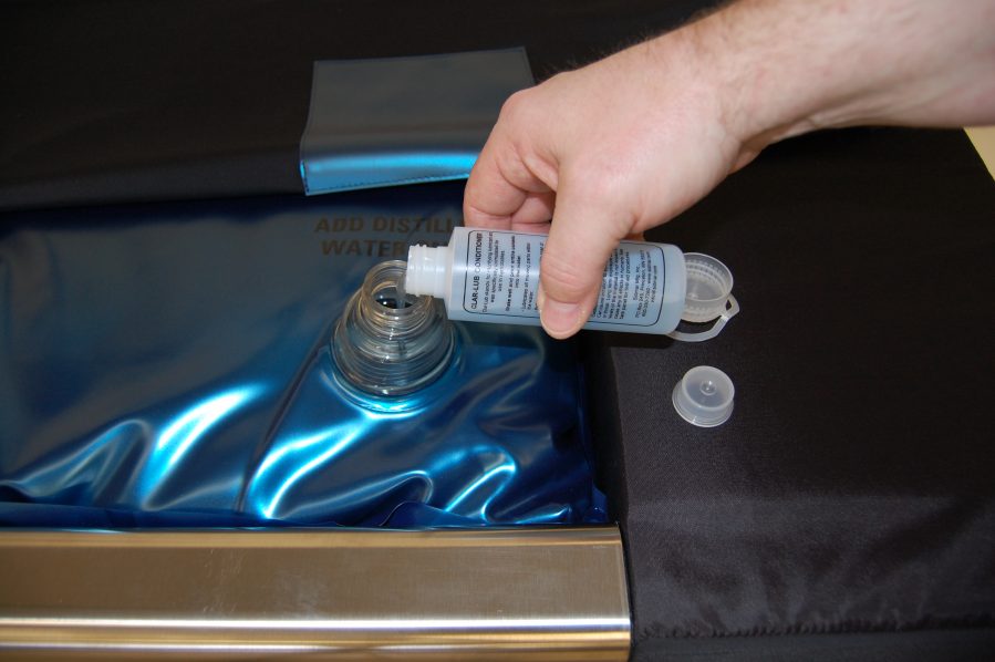 bottle of clar-lubfill spout pushed down into mattress on hydromassage tablelift fill spout above water mattress on hydrotableremove cap and seal on hydrotablepour Clar-Lub into fill spout on hydrotable